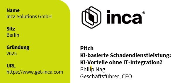 - Inca zeigt, dass es auch möglich ist, KI für die Ende-zu-Ende Bearbeitung von Schäden einzusetzen, ohne IT-Integration und ohne Change-Aufwand bei Mitarbeiter:innen.